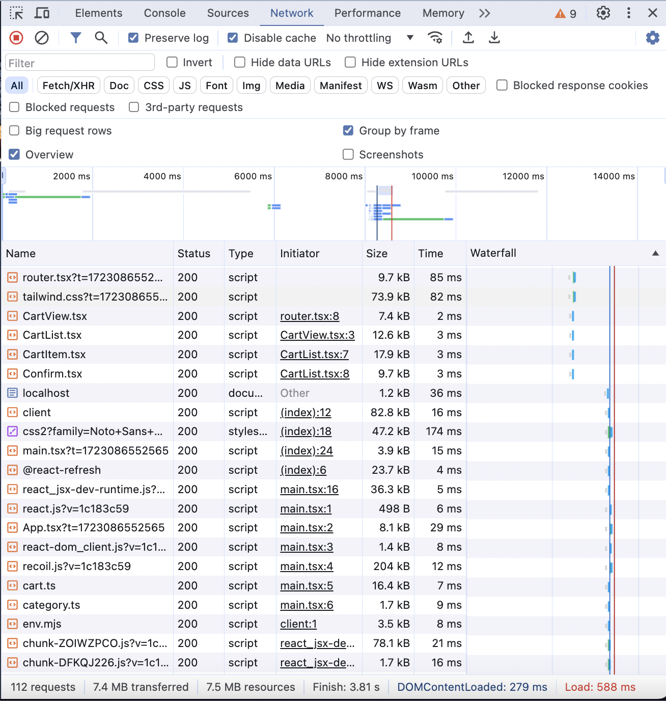 React.lazy()를 처리한 후 메인 페이지에서 CartView 컴포넌트를 로딩하지 않는 것을 확인할 수 있음